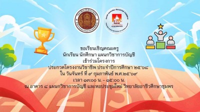 ขอเชิญคณะครู นักเรียนนักศึกษา แผนกวิชาการบัญชี เข้าร่วมโครงการประกวดโครงงานวิชาชีพ ประจำปีการศึกษา 2568