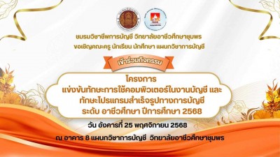 📢 ชมรมวิชาชีพการบัญชี ขอเรียนเชิญคณะครู นักเรียนนักศึกษาแผนกวิชาการบัญชี เข้าร่วมโครงการแข่งขันทักษะการใช้คอมพิวเตอร์ในงานบัญชี และทักษะโปรแกรมสำเร็จรูปทางการบัญชีระดับอาชีวศึกษา 2568 ในวันอังคาร ที่ 25 พฤศจิกายน 2568 ณ อาคาร 8 แผนกวิชาการบัญชี