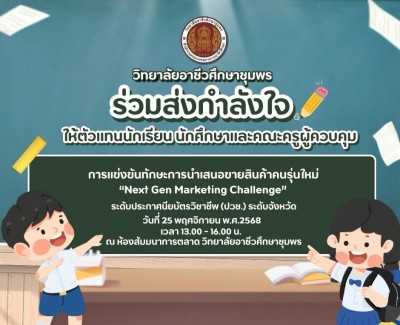 📣 ขอเชิญคณะครู นักเรียน นักศึกษาวิทยาลัยอาชีวศึกษาชุมพร ร่วมชม ร่วมเชียร์ การแข่งขันทักษะการนำเสนอขายสินค้าคนรุ่นใหม่ 'Next Gen Marketing Challenge' ในวันอังคารที่ 25 พฤศจิกายน 2568 เวลา 13:00 - 16:00 น. ณ ห้องสัมมนาแผนกวิชาการตลาด วิทยาลัยอาชีวศึกษาชุมพร