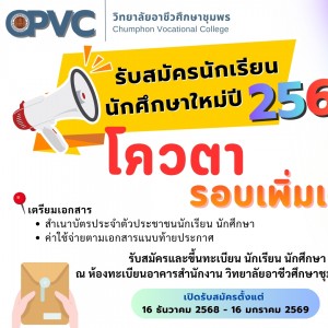 📢 รับสมัครนักเรียนนักศึกษาปี69 ‼️ โควตารอบเพิ่มเติม ‼️ 📌รับสัมครและขึ้นทะเบียนนักเรียน นักศึกษา ณ ห้องทะเบียน อาคารสำนักงาน วิทยาลัยอาชีวศึกษาชุมพร เท่านั้น!