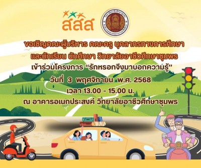 📢 งานโครงการพิเศษและการบริการชุมชน ขอเชิญคณะผู้บริหาร คณะครู บุคลากรทางการศึกษา และนักเรียน นักศึกษา วิทยาลัยอาชีวศึกษาชุมพร เข้าร่วมโครงการรักหรอกจึงมาบอกความรู้ วันจันทร์ที่ 3 พฤศจิกายน 2568 ณ อาคารอเนกประสงค์ วิทยาลัยอาชีวศึกษาชุมพร เวลา 13:00 - 15:00 น.